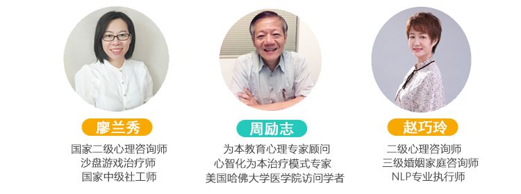 周鈺清為本教研專家導(dǎo)師國家二級心理咨詢師美國NGH催眠治療師中國心理健康委員會理事廣東省心理咨詢師協(xié)會理事個人簡介為幼兒園、小學(xué)、初中、高中等不同年齡段家長舉辦親子溝通講座及沙龍,加強家、校互動,結(jié)合家長、學(xué)校共同為孩子的心理成長獲取更適合的方法;對特殊兒童、問題兒童開展個體、團體心理輔導(dǎo);設(shè)計不同年齡段兒童社交能力、學(xué)習(xí)能力、增強